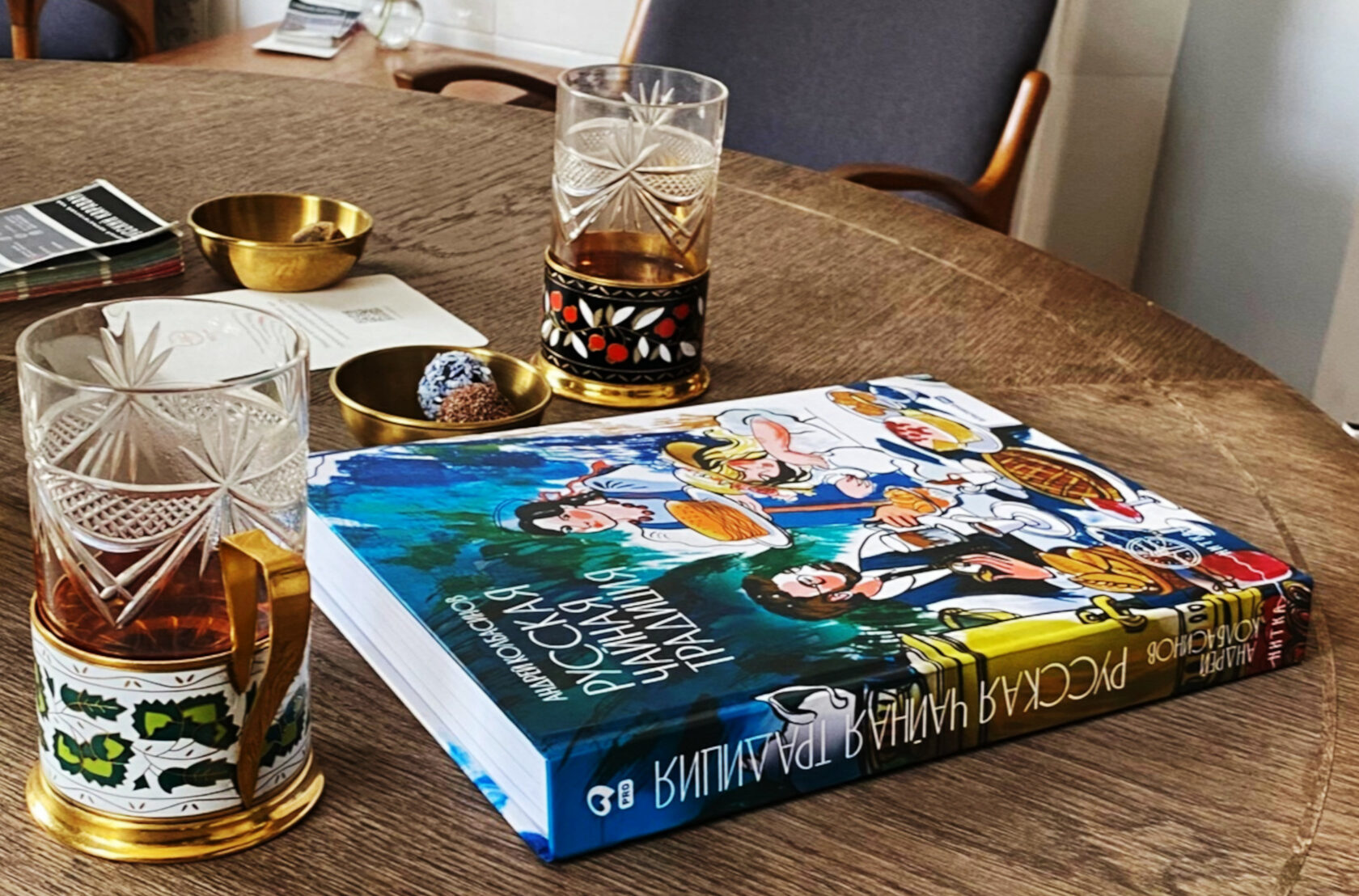 Наслаждаться культурой невозможно без истории. Поэтому я предложил Андрею рассказать про его книгу «Русская чайная традиция». Это настоящая исследовательская работа про чай. Тогда он резко встал из-за стола и направился к стойке у входа. На полке, за разноцветными упаковками чая, как раз стояла эта книга. Андрей принёс её нам с Настей и положил на стол.